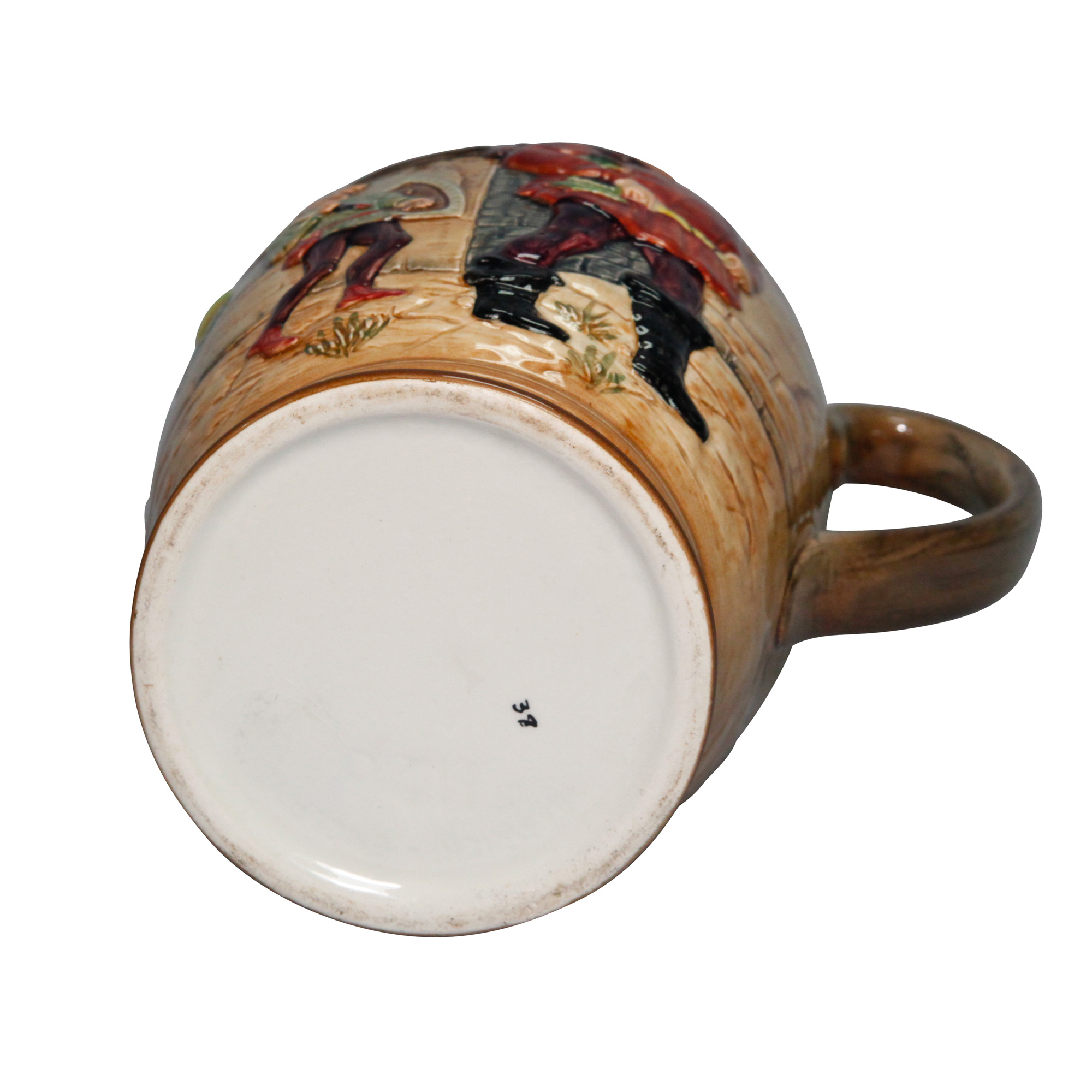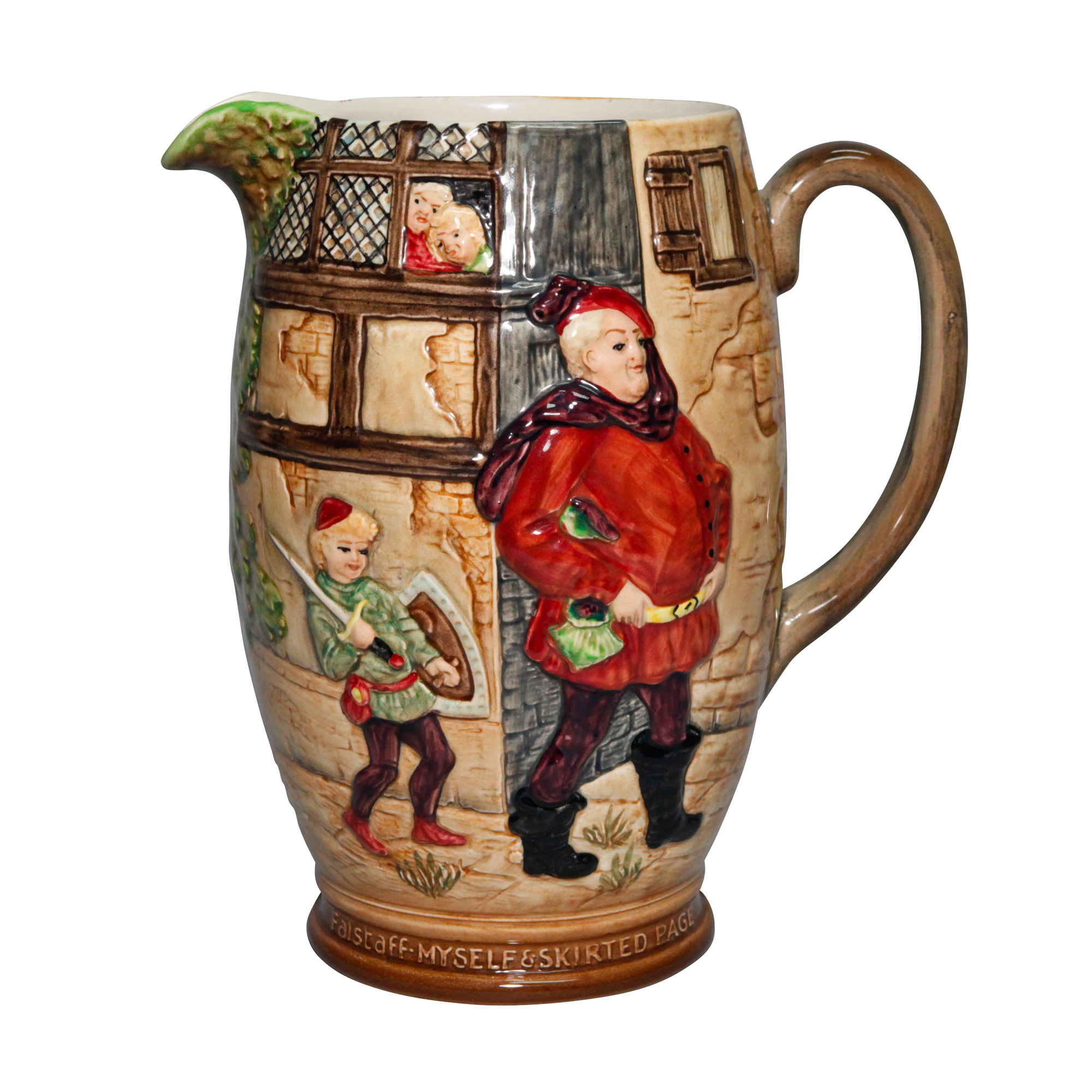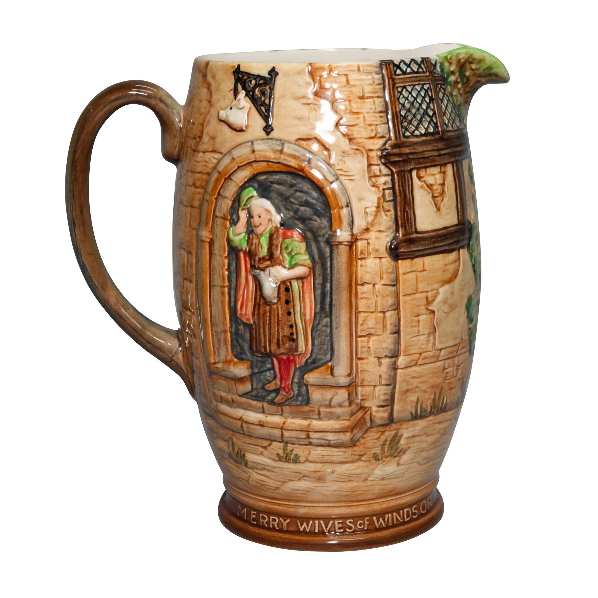 Rich with colorful details, this Beswick Shakespeare pitcher depicts the jovial Falstaff attempting to court the Merry Wives of Windsor.