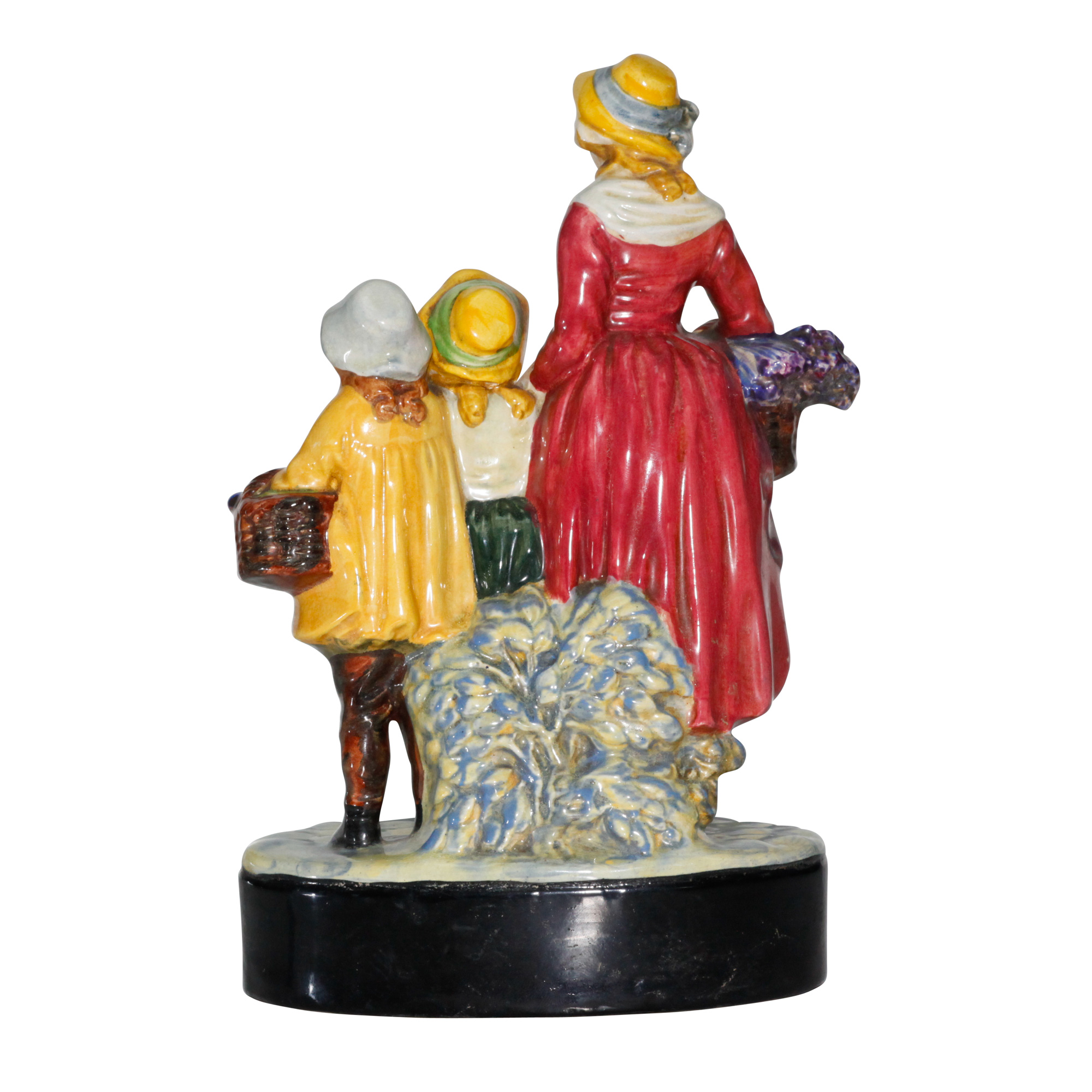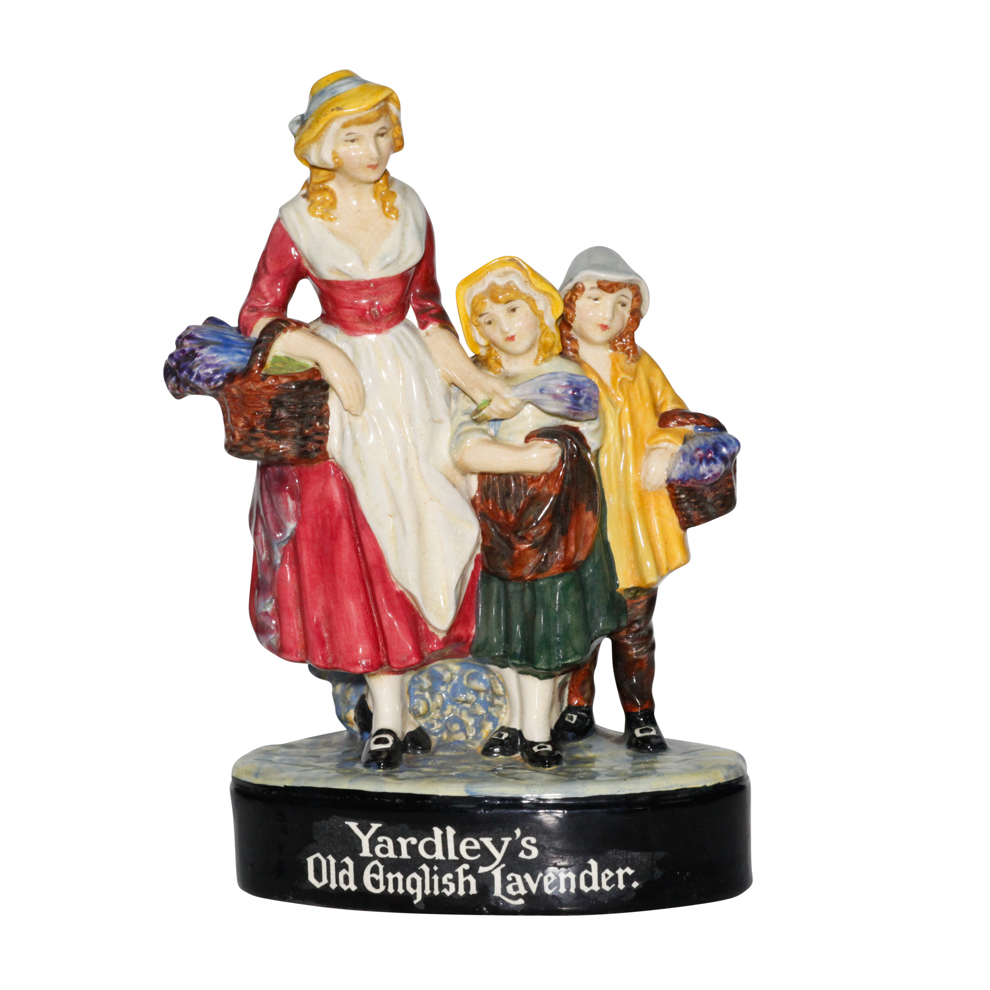 Advertising wares were introduced by Royal Doulton from the inception of its Burslem factory in the 1880s. By their very nature, such pieces are extremely scarce. Leslie Harradine adapted the Yardley lavender group as a figurine in 1924. Yardley of London, usually referred to simply as Yardley or Yardleys, is an international English-based company and one of the oldest firms in the world to specialize in cosmetics, fragrances and related toiletries products. Established in 1770, Yardley was a major producer of soap and perfumery by the beginning of the 20th century. In 1921, Yardley received its first Royal Warrant.